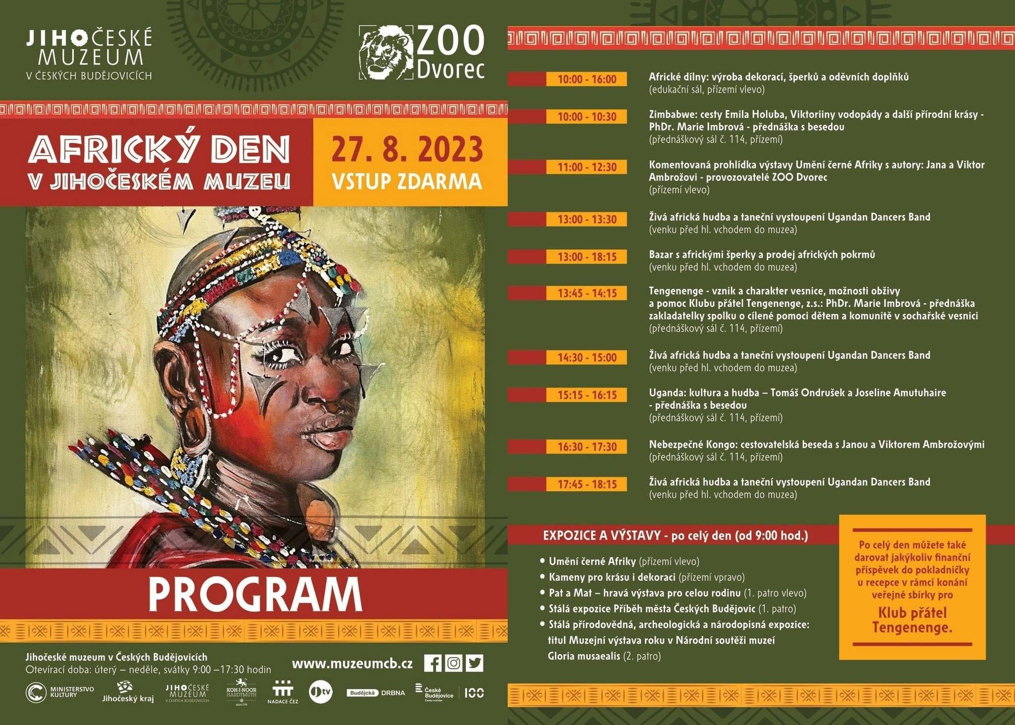 České Budějovice: Přijďte si s námi užít Africký den v muzeu! Zveme vás na doprovodnou akci k probíhající výstavě Umění černé Afriky, která se koná v neděli 27. srpna 2023 v hlavní budově Jihočeského muzea v Českých Budějovicích (Dukelská 1, České Budějovice).