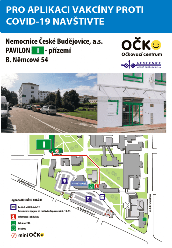 Na začátku října bude zprovozněno dočasné miniOČKO v ambulancích v přízemí pavilonu I (budova bývalé interny) Nemocnice České Budějovice, a.s., kde budou dokončeny aplikace druhých dávek u osob očkovaných na výstavišti první dávkou 18. září a později. Toto miniOČKO bude s počáteční denní kapacitou 100-250 vakcinací doplňkem k ordinacím praktických lékařů, kteří očkovali i nyní, od října však převezmou štafetu očkování ve větší míře, zejména pak aplikaci třetích dávek očkování. Parkování vozidel bude možné za standardních podmínek na hlavním parkovišti nemocnice nebo v areálu nemocnice na místech k tomu určených.