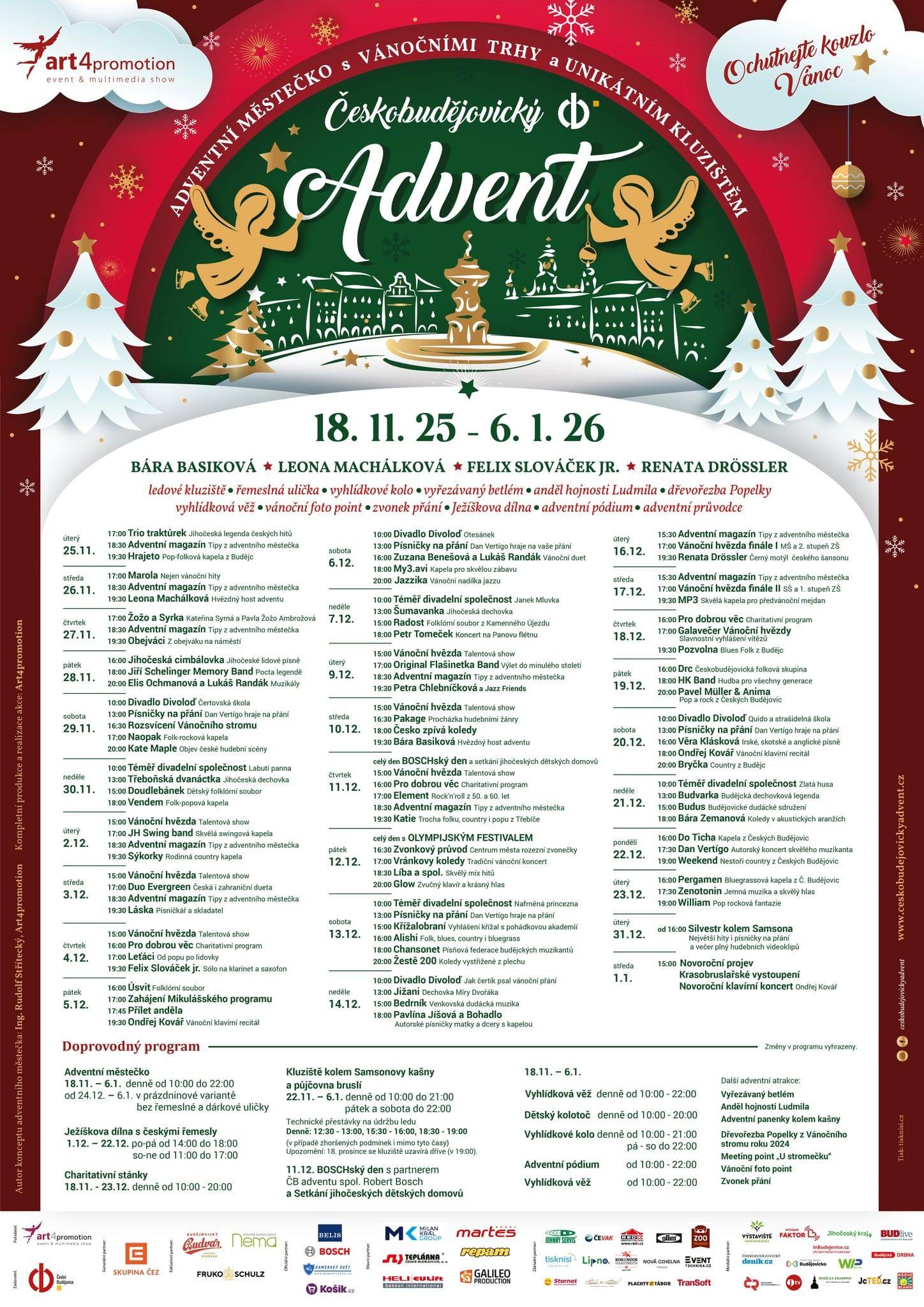 Znovu nebude chybět i hořící nápoj Pozdrav z pekla – oblíbená zážitková atrakce. Letos jej návštěvníci ochutnají v novém plechovém hrníčku vytvořeném ve spolupráci s českou smaltovnou BELIS, který se již tradičně stává sběratelským suvenýrem adventu. Na své si přijdou milovníci světelné výzdoby, rodiny s dětmi i všichni, kdo si chtějí vychutnat vánoční atmosféru na náměstí s hrnkem punče v ruce. A samozřejmě – ledové kluziště kolem Samsonovy kašny, neodmyslitelná ikona budějovického adventu, nebude chybět ani letos.