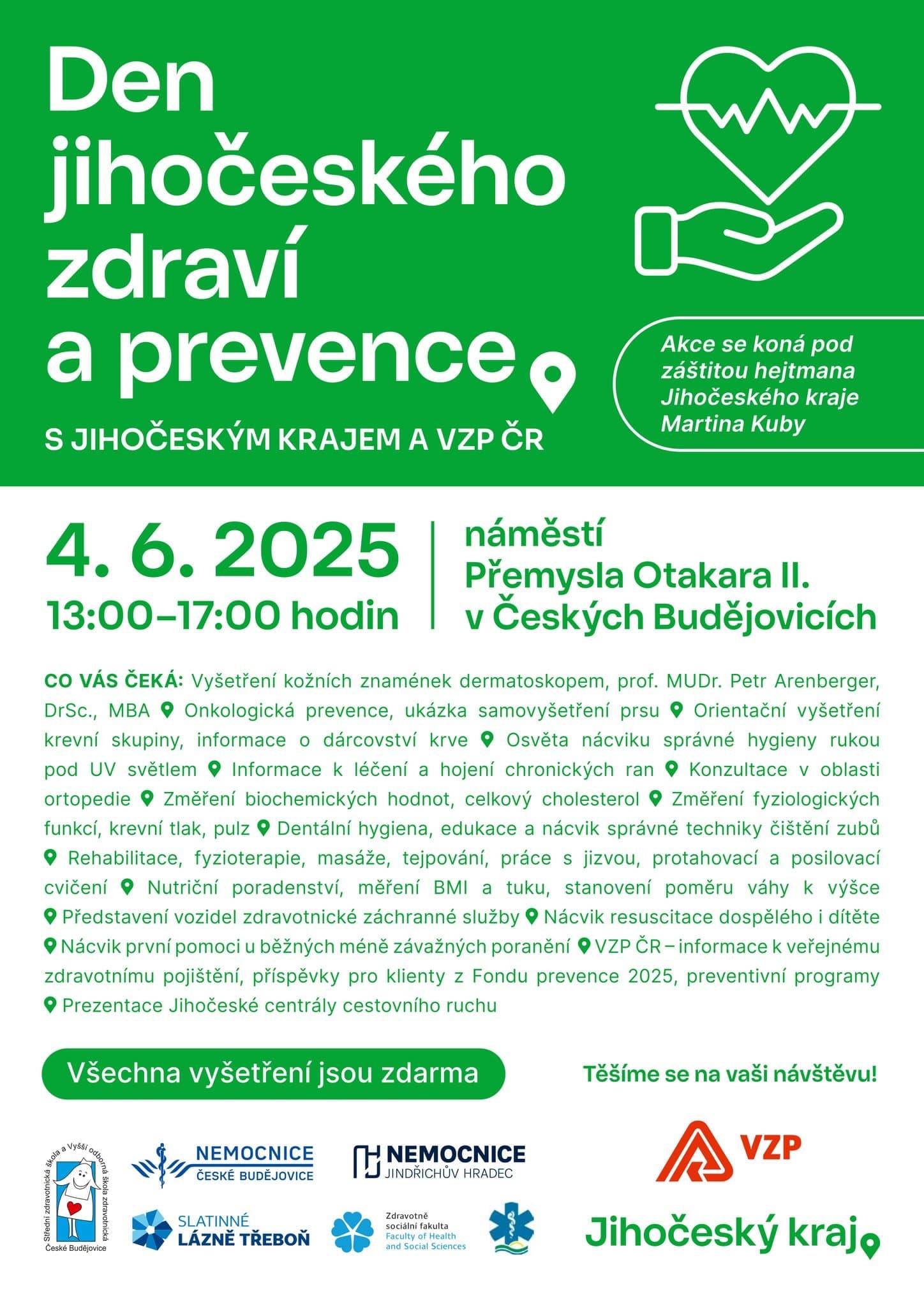 Zájemci, kteří na akci zavítají, si budou moci nechat vyšetřit kožní znaménka dermatoskopem, podstoupit orientační vyšetření krevní skupiny a získat informace o dárcovství krve. Ověří si správnost hygieny rukou pod UV světlem a zjistí, jaké mají hodnoty cholesterolu, krevního tlaku či pulzu. Připraveny jsou také konzultace v oblasti výživy, měření BMI a tělesného tuku, edukace v dentální hygieně a ukázka samovyšetření prsu. Na místě budou k dispozici i odborníci z oblasti ortopedie a fyzioterapie. Návštěvníci si budou moci vyzkoušet tejpování, rehabilitační a protahovací cvičení, masáže nebo práci s jizvou. Jihočeská záchranka představí svá sanitní vozidla a umožní veřejnosti praktický nácvik resuscitace dospělého i dítěte i první pomoci při běžných poraněních. Ve stánku Všeobecné zdravotní pojišťovny budou zájemcům zodpovězeny dotazy týkající nabídky a možností čerpání příspěvků z Fondu prevence či preventivních programů určených nejenom klientům VZP. Jihočeský kraj společně s Jihočeskou centrálou cestovního ruchu nabídne tipy na výlety vhodné pro nadcházející léto.