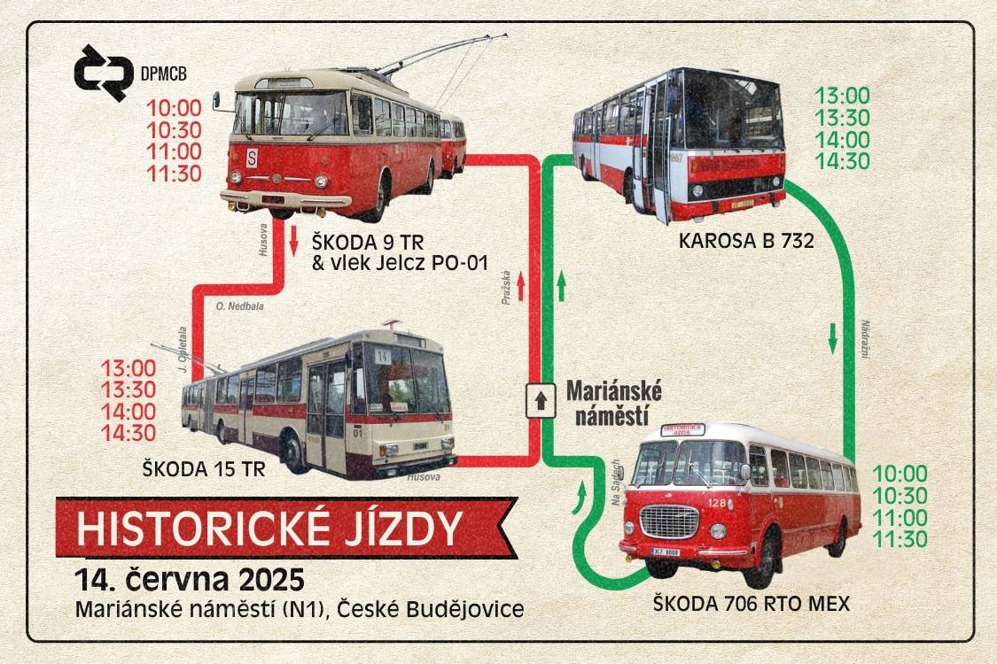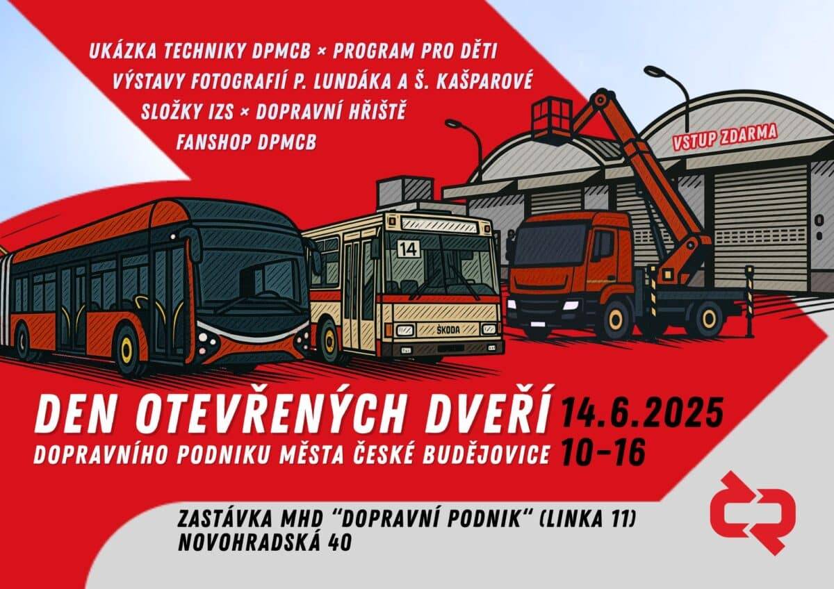 V souvislosti se dnem otevřených dveří se můžete 14. června zúčastnit také historických jízd z Mariánského náměstí a prohlídky Dopravního informačního a řídicího centra v areálu DPMCB Horní 22. Obě akce mají omezenou kapacitu, vstupenky rezervujte na cbsystem.cz.