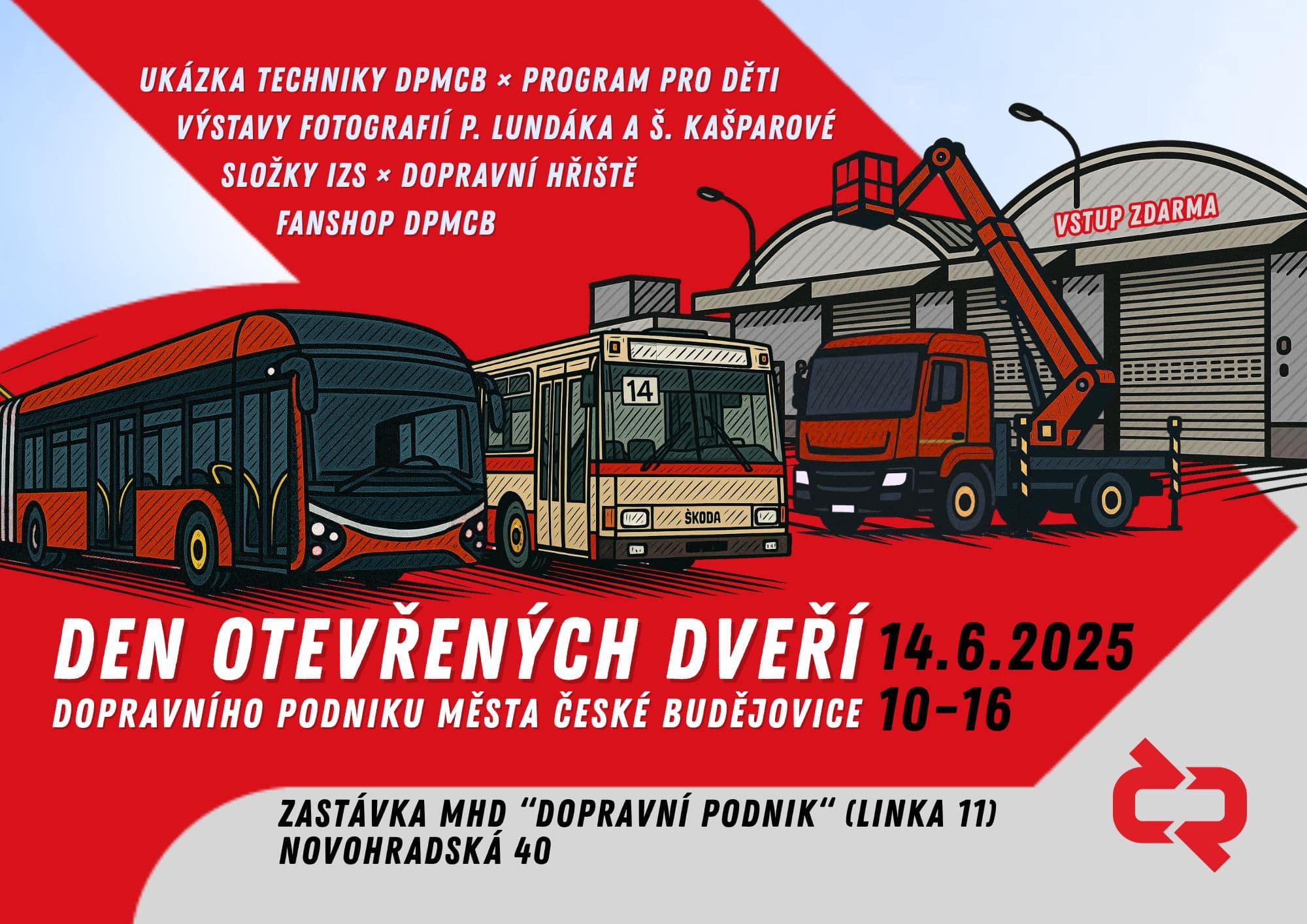 V areálu Novohradská 40 vás jako tradičně čekají ukázky techniky a činností Dopravního podniku města České Budějovice, a.s. – od provozu MHD po správu parkovací služby a veřejného osvětlení v Českých Budějovicích. Podívat se budete moct do zákulisí vozovny autobusů, vyvézt se do oblak na montážní plošině nebo si vyzkoušet montáž svítidel a botičky.