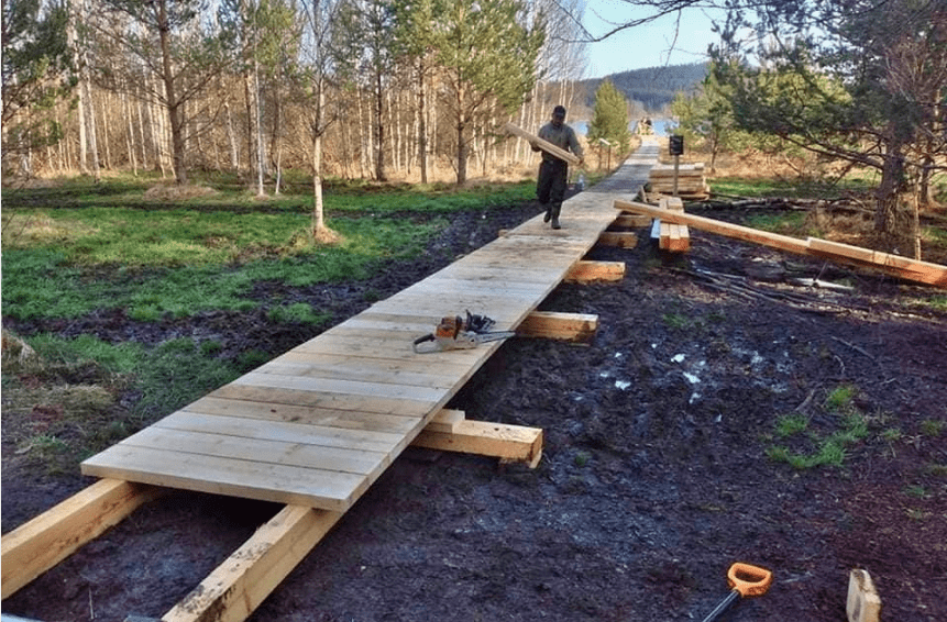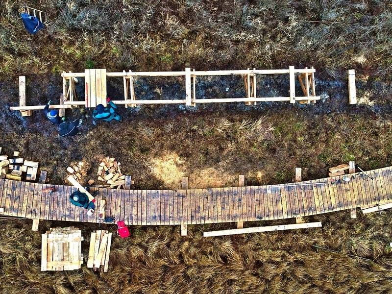 Její dostavbu Vojenské lesy a statky zahájily 15. dubna. Během necelých pěti týdnů zde státní podnik dobudoval bezmála tři čtvrtě kilometru povalových chodníků, na které spotřeboval téměř 100 kubíků jedlového a akátového dřeva. Aby v deštivém počasí stavebníci nepoškozovali okolní přírodu, částečně materiál na stavbu dopravovali po hladině rybníku svázaný do voru.