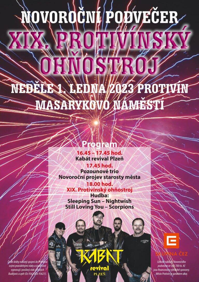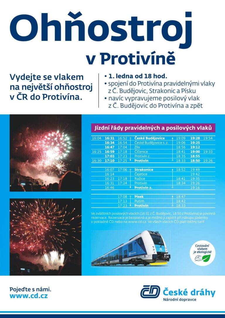Největší novoroční ohňostroj odstartuje v Protivíně 1. ledna 2023 v 18 hodin. Z Českých Budějovic vyjedou vlaky v 16:04, další 16:52 a posilový spoj v 16:31. V tomto posilovém vlaku, který zastaví například i ve stanici Zliv nebo Číčenice, je povinná rezervace. Ta je bezplatná a cestující si ji mohou zakoupit při nákupu jízdenky v pokladně ČD nebo na www.cd.cz.
