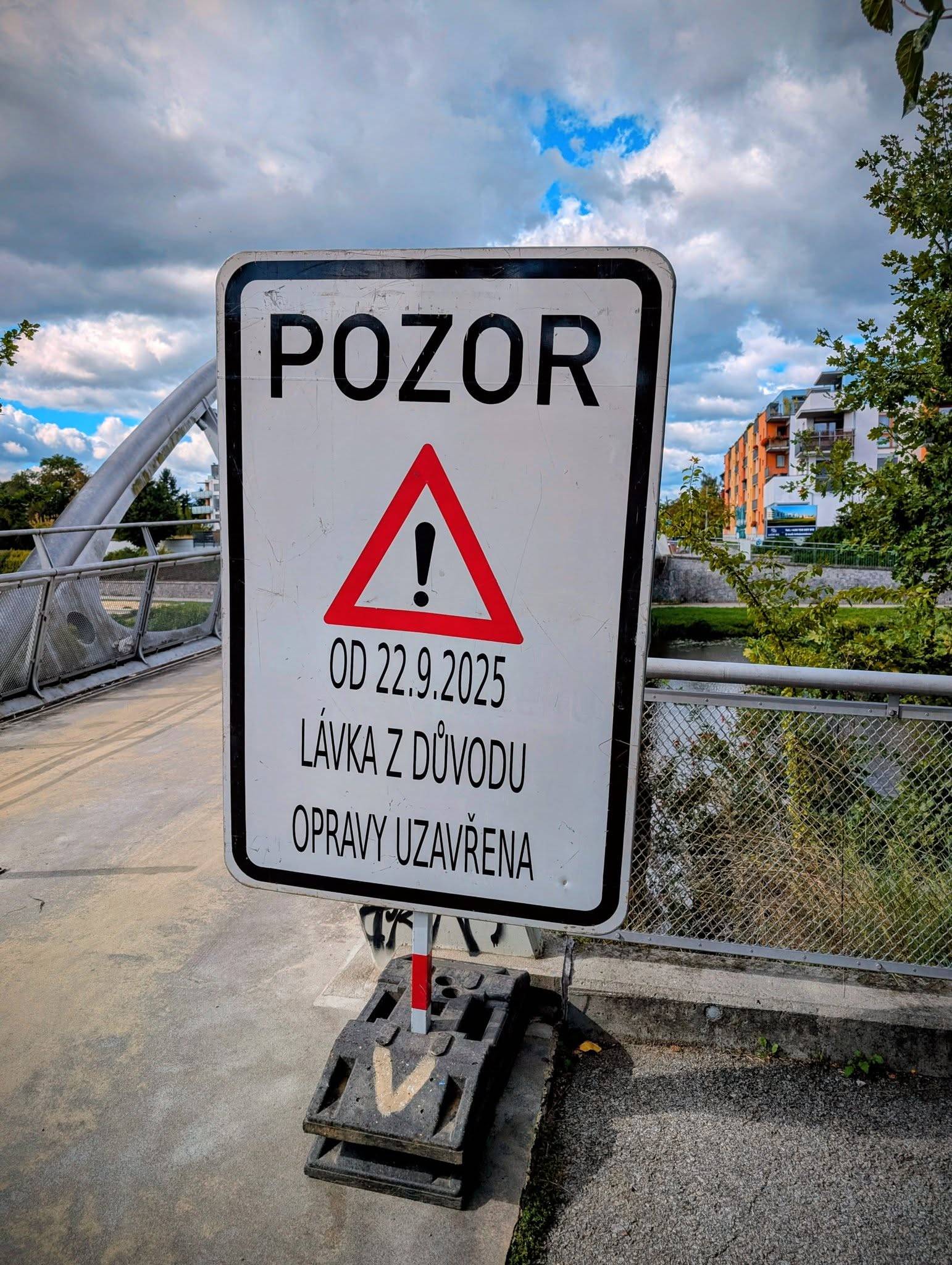 Obnova je dlouhodobě plánovaná a jejím hlavním účelem je zajištění bezpečnosti uživatelů a prodloužení životnosti mostní konstrukce. Obchozí trasa vede přes lávku u Sodovkárny. Předpokládaný datum ukončení stavebních prací je 10. listopadu 2025. Děkujeme za trpělivost a pochopení.
