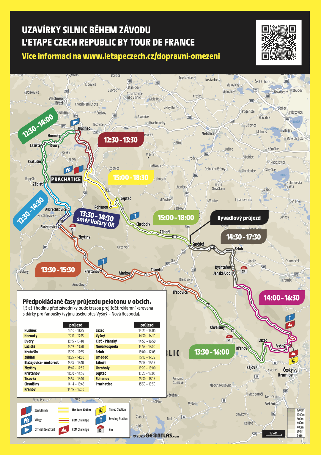Start a cíl závodu je situován na Prachatické Velké náměstí. Odkud se závodníci přesně ve 13.00 vydají na trasu dlohou 101,8 kilometrů. Z důvodu bezpečnosti je trasa závodu během průjezdu závodníků uzavřena pro veškerou dopravu. Informace o dopravních omezeních najdete zde…