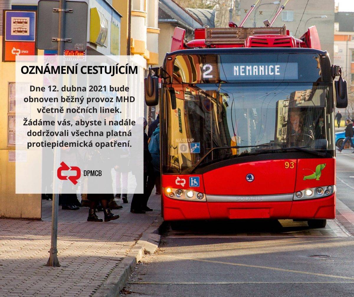Spolu s ohlášeným ukončením nouzového stavu v ČR bude od pondělí 12. dubna 2021 obnoven běžný režim MHD.