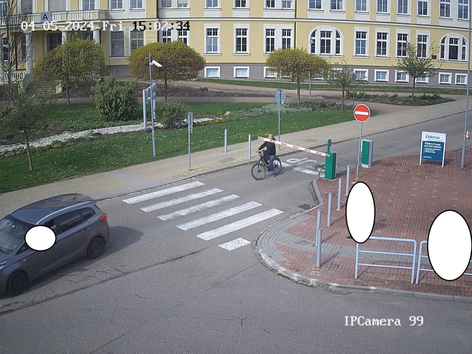 Dosud neustanovený cyklista jel dne 5. dubna 2024 v 15:02 hod., v Českých Budějovicích, po ulici Boženy Němcové směrem k hlavnímu parkovišti zmíněného zdravotnického zařízení, kdy pravděpodobně nerespektoval dopravní značení Stůj a pokračoval v jízdě za projíždějícím motorovým vozidlem, kdy však narazil do sklápějící se závory, kterou poškodil. Poté se pár minut na parkovišti zdržel a následně odjel k výjezdu.