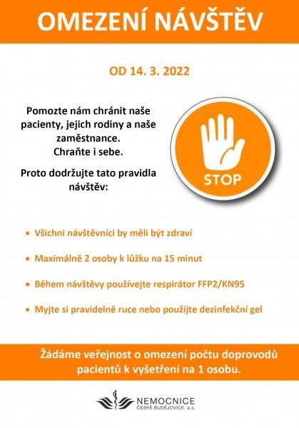„Díky relativně příznivé epidemické situaci a aktuálně platnému mimořádnému opatření MZČR umožnilo od pondělí 14. března návštěvy veřejnosti. Ve snaze ochránit naše pacienty, jejich rodiny i zaměstnance nemocnice prosíme veřejnost o dodržování následujících pravidel,“ uvádí generální ředitel Nemocnice České Budějovice, a.s. MUDr. Ing. Michal Šnorek, Ph.D.: