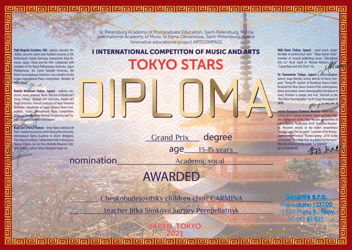 V letošním roce Carmína získala historicky 6. Grand Prix v I. International Competition of Music and Arts „TOKYO STARS” 2021. Jedná se o světovou prestižní online soutěž v Japonsku. Soutěže se zúčastnilo 24 států.