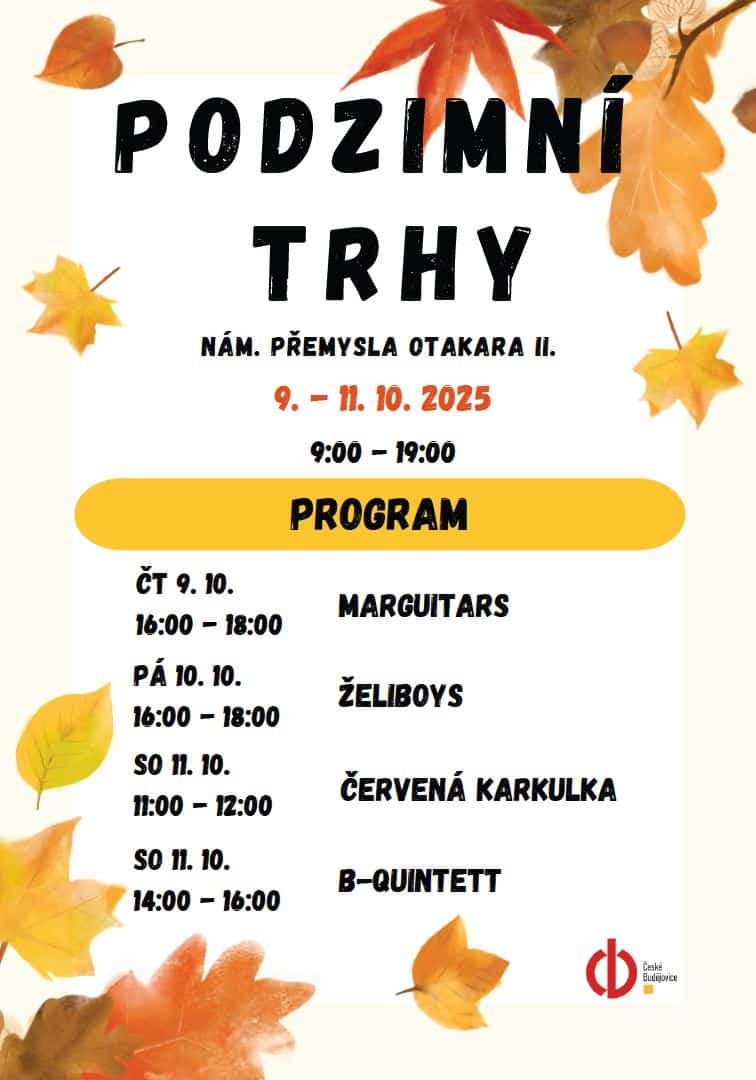 České Budějovice – Oblíbené podzimní trhy obsadí náměstí Přemysla Otakara II. od čtvrtka 9. do soboty 11. října 2025. Ve 120 stáncích se představí řada prodejců tradičních českých výrobků a desítky řemeslníků s originálním zbožím, někteří i s předváděním svého řemesla u stánku nebo s dětskou dílničkou, například sklářskou. Svůj um předvede třeba řezbář i košíkář. K vidění bude také drátování, malování keramiky, ruční tkaní, předení i výroba šperků.