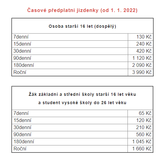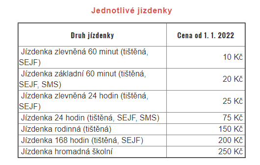 Úprava cen se dotkne jednotlivých i časových předplatních jízdenek. Za základní šedesátiminutovou jízdenku zaplatí nově cestující 20 Kč, tedy o 4 Kč navíc. O 5 Kč naopak od 1. ledna 2022 zlevní SMS jízdenka na srovnatelnou cenu. Zlevněnou šedesátiminutovou jízdenku nově pořídíte za 10 Kč, celodenní jízdné pak za 75 Kč, resp. 25 Kč v jeho zlevněné verzi. Přehled nových cen schválených pro další druhy jednotlivých jízdenek naleznete v přiložené tabulce.