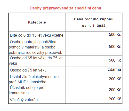 Také částka za pořízení časové předplatní jízdenky se od nového roku zvýší, a to zhruba o 10 procent. Osobám s nárokem na přepravu za speciální cenu nabídne DPMCB roční kupóny za 500 Kč. Výjimkou budou váleční veteráni, účastníci odboje a odporu proti komunismu a držitelé medaile prof. MUDr. Janského, kteří i v následujícím období budou moci využít služeb MHD za 200 Kč ročně. Cena 500 Kč za roční kupón bude nově platit i pro seniory ve věku 65 až 75 let. Novinkou je, že osobám nad 75 let věku bude nově umožněno cestovat bez zakoupení jízdního dokladu. K tomu budou moct využít např. občanský průkaz.