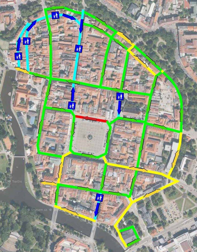 Změna dopravního značení ukončí tranzitní dopravu přes náměstí, zklidní se doprava také u Černé věže a v Piaristické. Všichni rezidenti a zásobování se dostanou, kam potřebují. Aby byly současné pěší zóny skutečně pro pěší, zajistí vysouvací sloupky. Parkování na části náměstí zůstane, vyhradí se ale z většiny rezidentům. Severní strana náměstí zůstane bez aut úplně. Nahradí je zeleň a nový mobiliář.