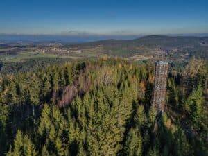 🚶‍♂️ Přístup: K rozhledně vede asi 1 km dlouhá lesní cesta, která je poměrně strmá, ale dobře značená (žlutá turistická trasa). Po dešti může být kluzká.