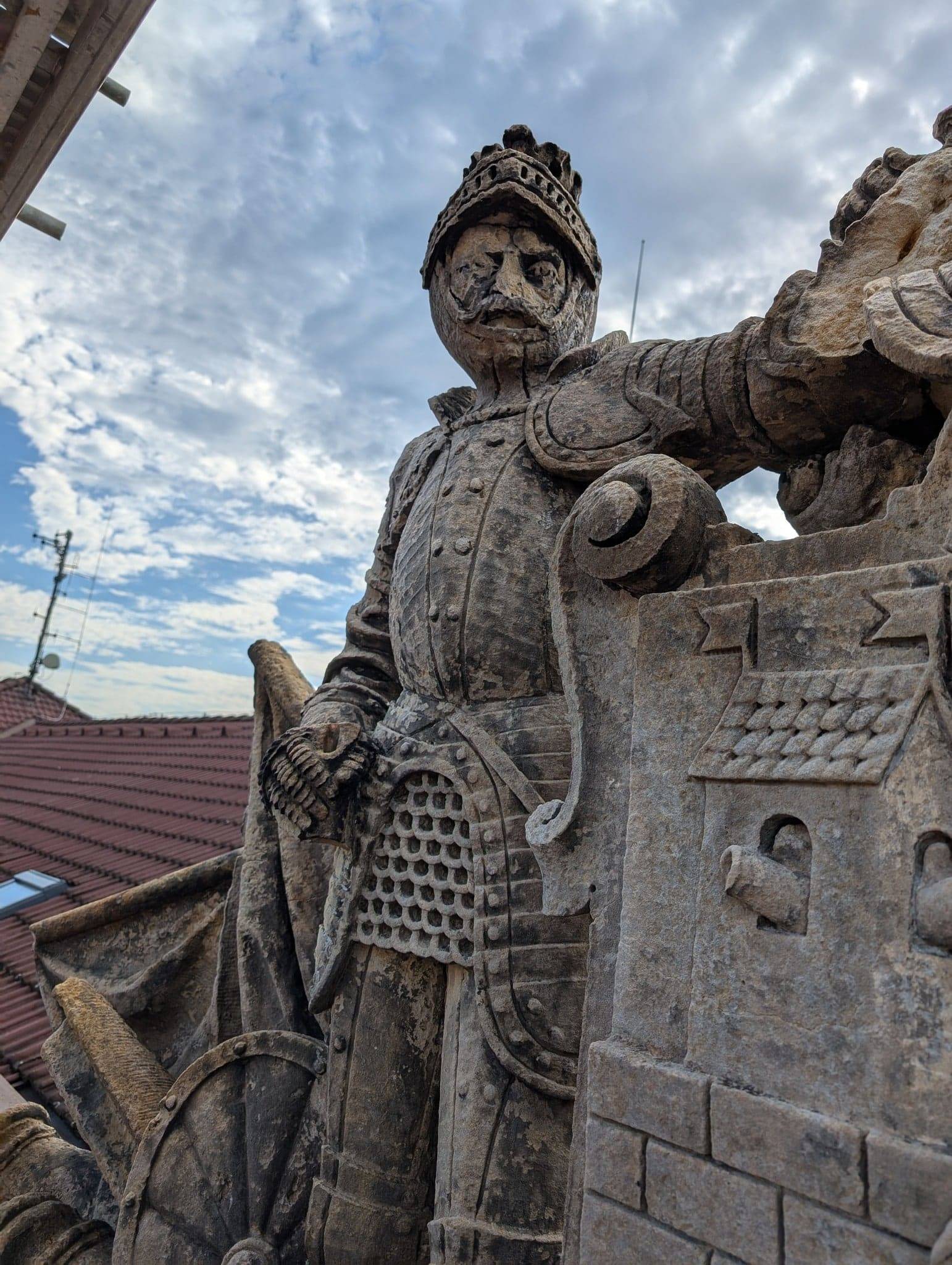 České Budějovice – V současné době je restaurováno sousoší umístěné na atice budovy Hasičského záchranného sboru na Pražské třídě, bývalých dělostřeleckých kasáren. To má podobu původního znaku Královského města České Budějovice, který je držen dvěma rytíři v brnění, obohacené o motivy kanónů a dělových koulí.