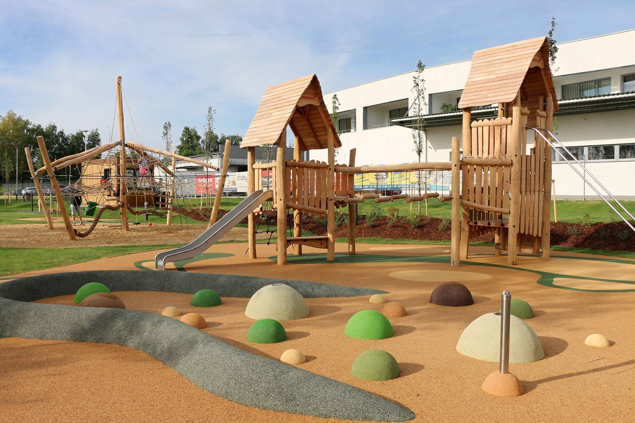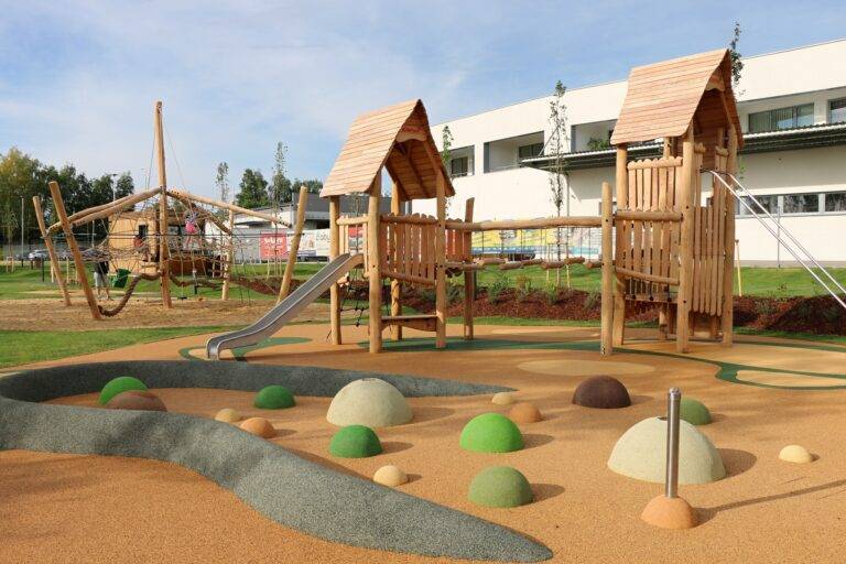 Kurty na plážový volejbal, workoutové, parkourové i dětské hřiště s čarodějovou dvouvěžovou pevností, pískovištěm, kolotočem, provazovou džunglí, houpadly i mlhovištěm, restaurace a další vybavení bylo postaveno v rekordním čase, za pouhých 55 dní, v oblíbené lokalitě u cyklostezky z Budějovic na Hlubokou nad Vltavou.