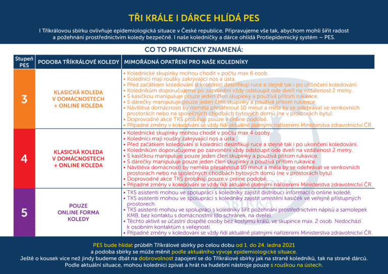 Vzhledem k aktuální epidemiologické situaci a celostátně přijatým opatřením rozhodlo vedení Charity Česká republika, že po dobu trvání pátého stupně PES kolednické skupinky do ulic nevyrazí.