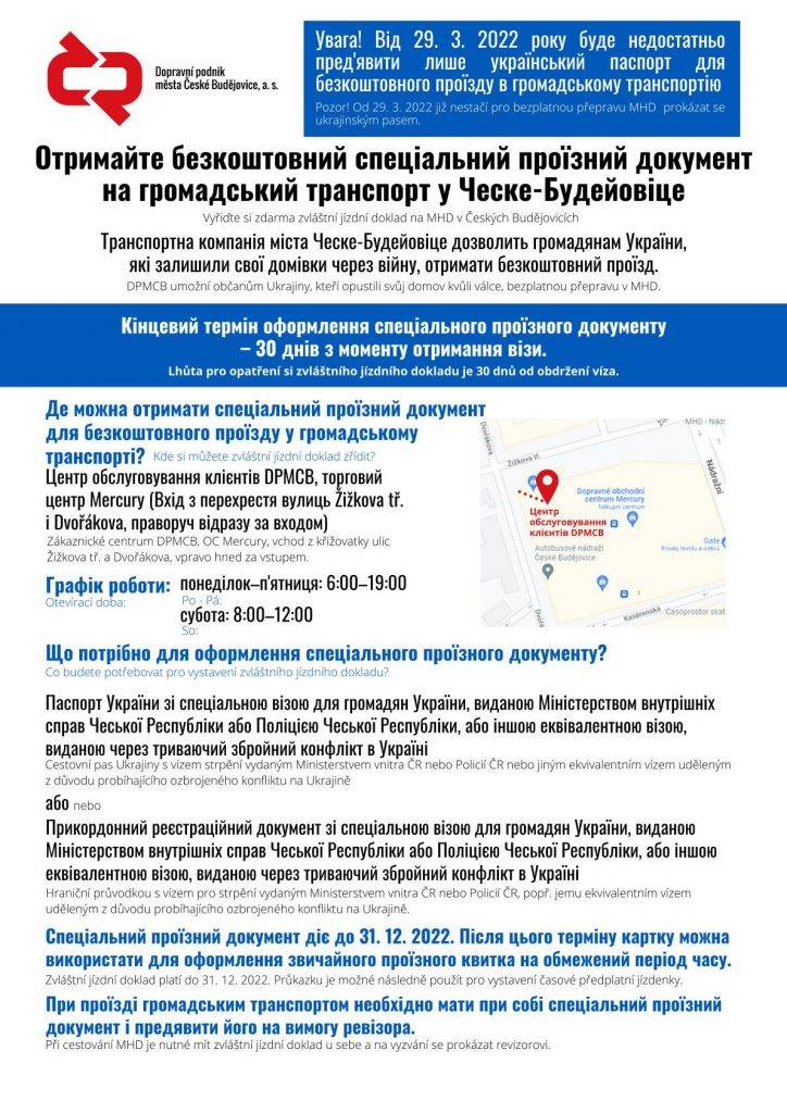 Pro potřeby evidence cestujících je ale třeba, aby si zajistili průkazku, která je opravňuje k jízdě zdarma městskou hromadnou dopravou až do konce letošního roku. Průkazku si vyřídí v pobočce zákaznického centra dpravního podniku v přízemí OC Mercury u nádraží. Na místě předloží cestovní pas s vízem pro strpění vydaným Ministerstvem vnitra ČR nebo Policií ČR nebo jeho ekvivalent udělený z důvodu války na Ukrajině,“ uvedl primátor Jiří Svoboda s tím, že na vyřízení budou mít celý měsíc od data, kdy na jih Čech přišli.