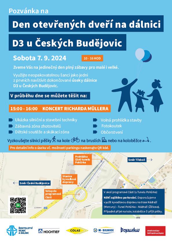 Pro konání akce Den otevřené dálnice D3, která proběhne v sobotu 7.9.2024, kdy na místě není umožněno parkování aut návštěvníků, bude od nádraží z Českých Budějovic pro návštěvníky posílena veřejná doprava na akci a zpět. Dne 7.9.2024 bude v provozu přímá linka číslo 79 v úseku Nádraží – Tunel Pohůrka, s odjezdem ze stanoviště N6 (od MERCURY) s výstupem na provizorní zastávce u Tunelu Pohůrka, zpět se linka bude vracet na výstupní zastávku Nádraží, stanoviště N1 (v Žižkově třídě). První spoj linky vyjede od Nádraží v 9:40h dále pak podle jízdního řádu a poslední spoj vyjede od Tunelu Pohůrka v 17:00h. . Označena bude „DEN OTEVŘENÉ DÁLNICE D3,“. Uvedená linka č. 79 bude pro návštěvníky zdarma.