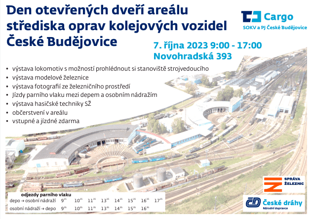 V sobotu 7. října 2023 se v areálu Střediska oprav kolejových vozidel v Českých Budějovicích uskuteční den otevřených dveří pro širokou veřejnost 😁