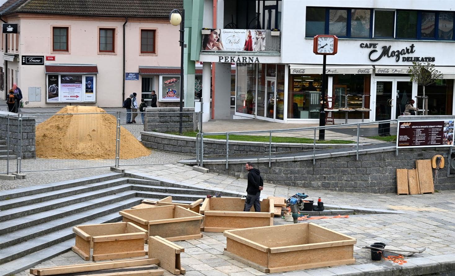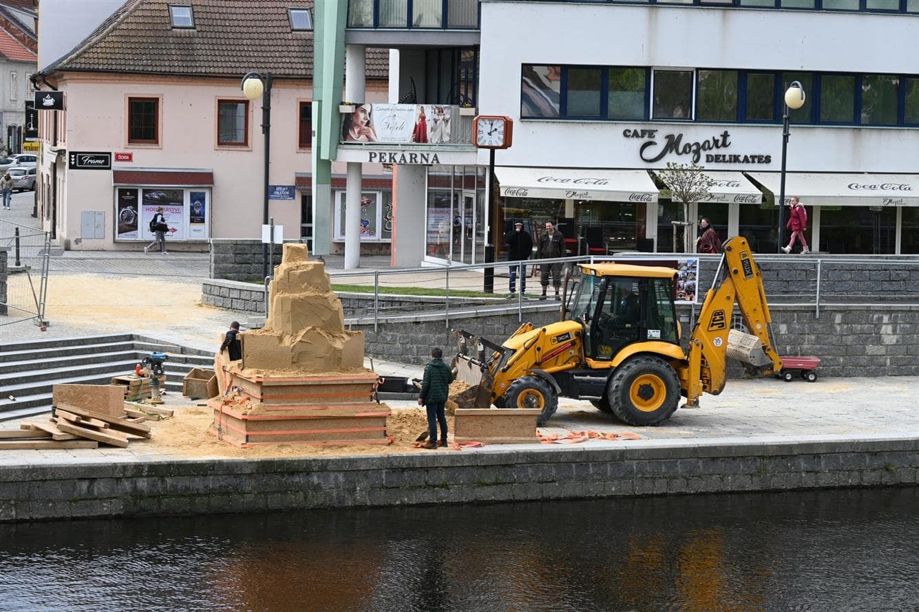 Písek – Sochaři dnes začali pracovat na prvních dvou obřích pískových sochách. Ráno nákladní auto přivezlo speciální štukový písek, který bagr postupně nasypal do připraveného bednění. Sochaři písek průběžně hutnili, aby z něj bylo možné díla vyřezávat.