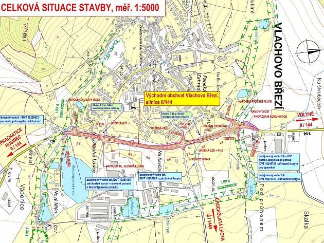 Stavba východního obchvatu Vlachova Březí na silnici II/144, která náleží do majetku Jihočeského kraje, předpokládá odpojení se od stávající trasy silnice od Husince za mostem přes Libotyňský potok, dále pokračuje přes zatravněné zemědělské plochy mezi obytnou zástavbou města a průmyslovou částí a kříží silnici III/1449 do Chocholaté Lhoty. Na silnici do Újezdce a Předslavic se obchvat zpět napojuje před výrobním areálem firmy Reno Šumava, a. s. „Délka obchvatu je 1130 m. Spolu s realizací této nové komunikace budou provedeny také některé další práce, a to např. nezbytné úpravy křižovatek, postaveno bude 258 m opěrných zdí a 459 m protihlukových stěn. Dále bude komunikace odvodněna a přibude veřejné osvětlení,“ uzavřel Hajdušek.