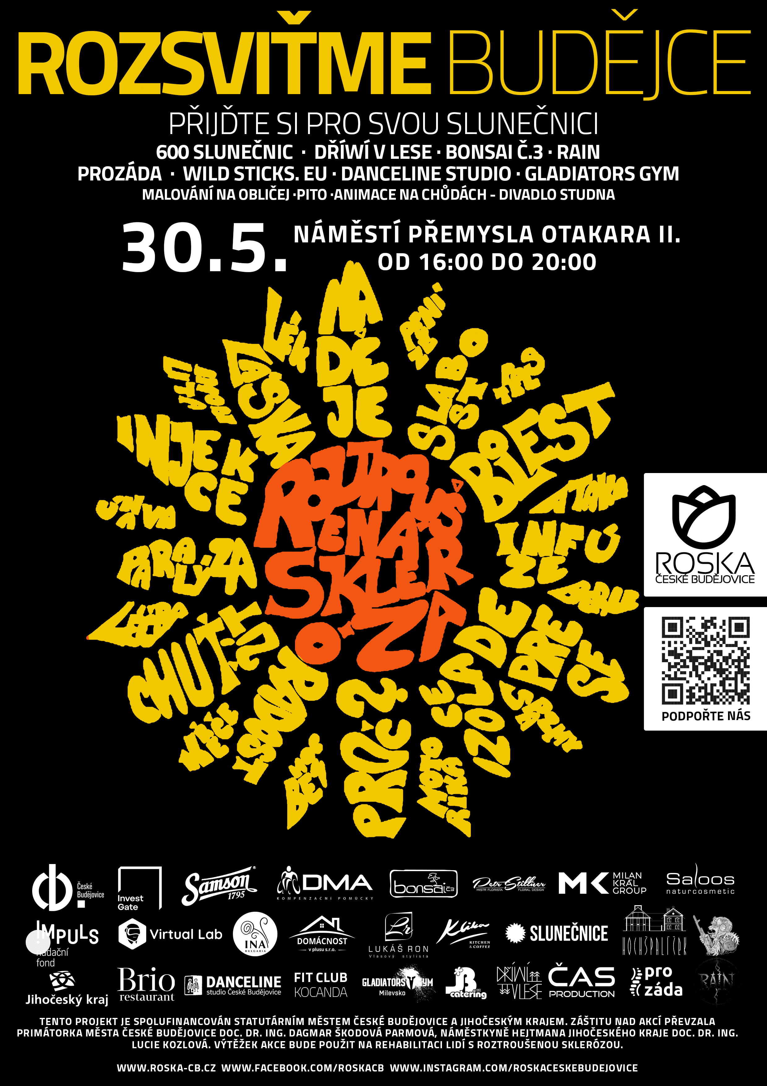 Stále se potýkáme s tím, že se toho o RS moc neví. Prvotní projevy nemoci mohou být nenápadné, zpočátku lidé mohou cítit jen pouhé brnění prstů. Akcí Rozsviťme Budějce chceme na nemoc upozornit a zároveň pacienty v boji s ní podpořit,“ říká Věra Švábová, ředitelka organizace ROSKA České Budějovice. Návštěvníci se mohou těšit nejen na slunečnice, ale také na bohatý kulturní program pro malé i velké – divadlo Studna nás bude provázet na chůdách, bude připravena Roztroušená stezka, na níž lze vyzkoušet jízdu na invalidním vozíčku, vystoupí děti z Danceline studia, bojové umění nám předvede Gladiators Gym, Ing. Jana Janíčková představí metodu Spirální stabilizace páteře, krev rozproudí bubny Wild Sticks, a k poslechu zahrají kapely Dříwí v Lese, Bonsai č. 3 a RAIN.